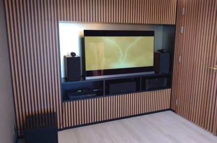 リアスピーカーと立体音響用トップスピーカーは、埋め込みで設置致しました。リビングの動線を阻害しません。今回は天井の木目の色味を考慮し、グリル無しでセッテイング致しました。スピーカーのブラックが深みのある木目にアクセントを加えております。