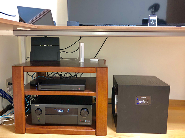 AVアンプはDENON AVR-X4500Hを導入し、最新のDolby Atmosに対応。マルチチャンネル再生における精密な音場構築を可能にし、映画や音楽ソフトだけでなく、ゲームやライブ映像においても高い没入感を実現いたします。