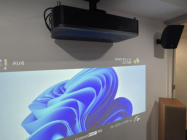 プロジェクターには、天吊設置が可能な超短焦点モデル「EPSON EH-LS800」を選定しました。最終的なホームシアターの仕様は、防音業者様からの引き渡し後に現場を下見しながら決定。プロジェクターの天吊金具は特注で長さを延長し、HDMIケーブル出口との干渉を避けつつ、見やすい画面高さに調整いたしました。