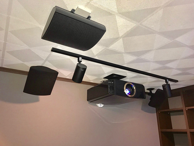 天吊り設致しましたサラウンド・トップスピーカーは、Dolby Atmosコンテンツの魅力を存分に引き出し、包み込まれるような音響体験を提供します。JVCプロジェクターの組み合わせにより、映像と音の臨場感を最大限に引き出しています。