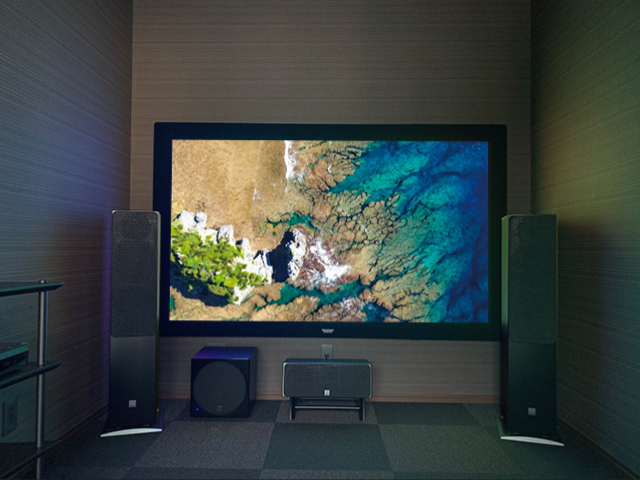 サウンドはDALI OBERONシリーズに統一し、音の定位と一体感を追求。天井にはJBL PRO「CONTROL 23-1」を設置し、高さ方向の臨場感も加えることで、映像と音がシームレスにつながる没入空間を演出しています。