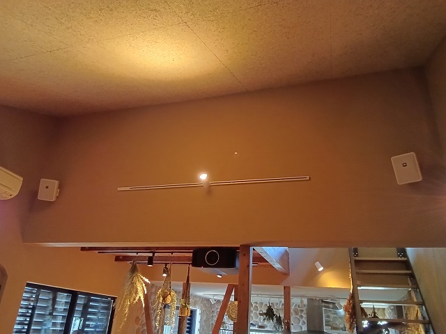 ドルビーアトモス用のトップスピーカーは勾配天井へ、サラウンドスピーカーは壁面へ設置。可能な範囲でドルビーアトモス再生の推奨レイアウトに倣いながらも、生活空間を圧迫しないよう配慮した、バランスの良いスピーカー配置が実現されています。