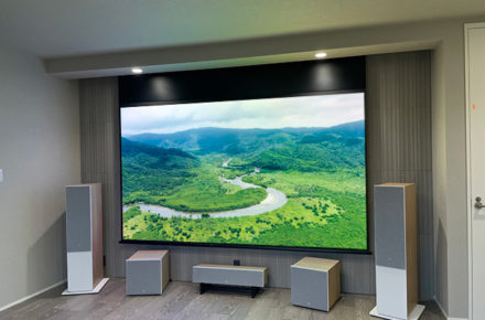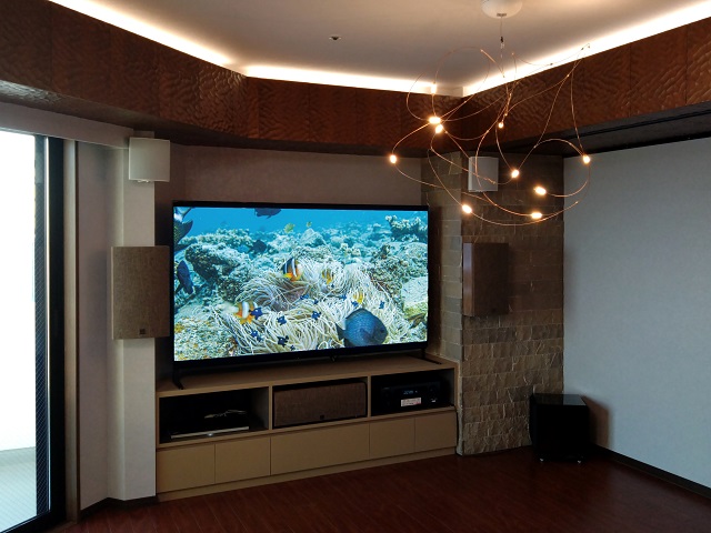 ご自宅のリフォームに併せて「リビングにシアターシステムを導入したい」というオーナー様のご要望を受けて、お手持ちのテレビサイズに合わせたスピーカーレイアウトなど、事前に細かな打ち合わせを行い完成したリビングシアターです。