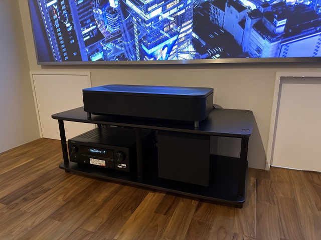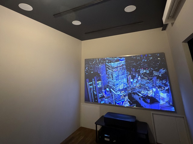 茶室をコンセプトとした個性的なお部屋の雰囲気に調和する、超単焦点プロジェクターによるスタイリッシュなホームシアターが完成いたしました。