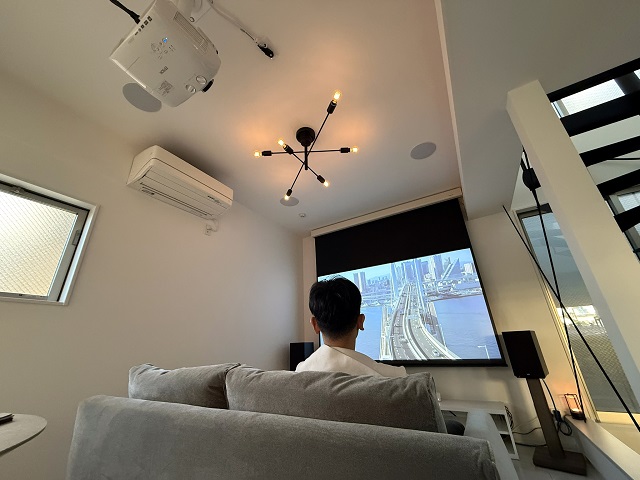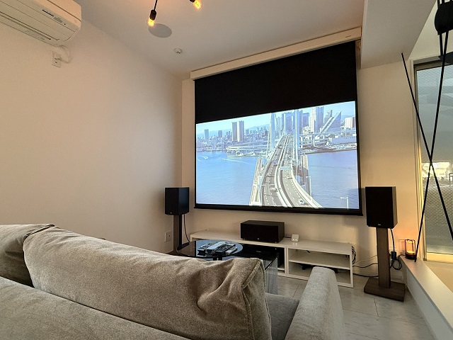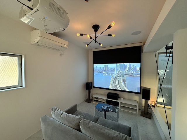 スクリーンを下ろし、照明を落とした瞬間、リビングは本格的なシアタールームへと変貌します。