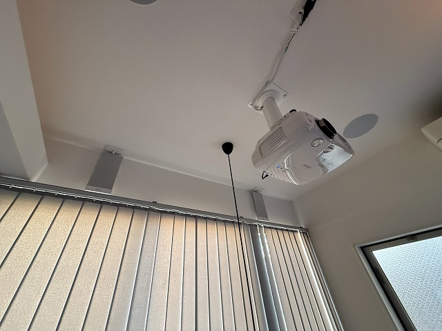 また、インテリア性の高い照明器具が約30cmの長さだったため、プロジェクター用の天吊り金具は特注の35cm仕様へ変更しています。天吊り金具のカラーは、天井やプロジェクターに合わせたホワイトとし、空間に自然に溶け込む仕上がりとしました。