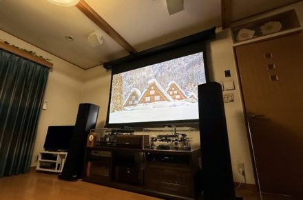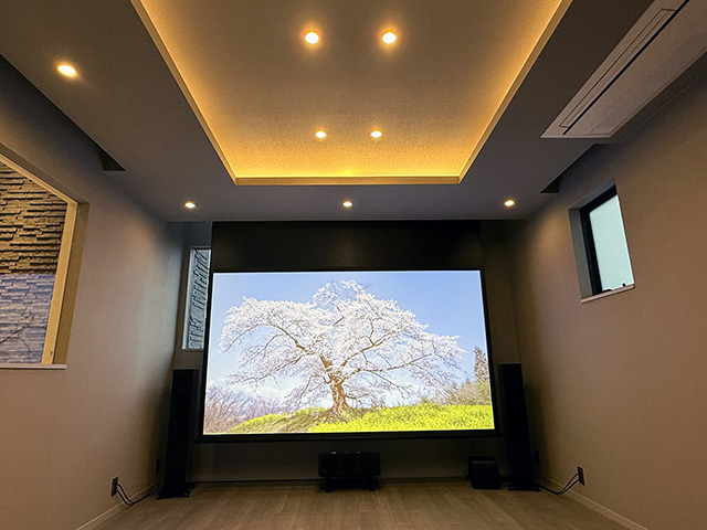 シンプルで扱いやすい機器構成としながらも、120インチの大画面映像と臨場感あふれるサラウンドにより、非日常を味わえる贅沢な視聴空間に仕上がっています。