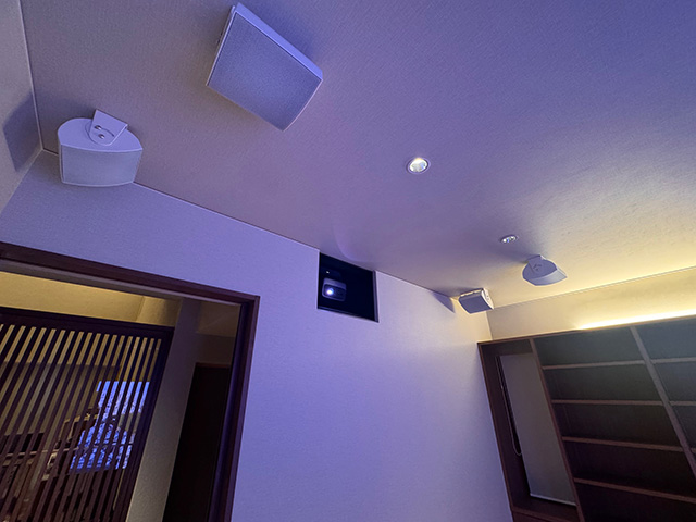 天井に取り付けた角度調整が自由なサテライトスピーカーにより臨場感に包まれたサウンド空間が魅力です。 プロジェクターは壁をくり抜いて箱をつくったイメージとなっており、少しでも投写距離を稼ぐための工夫が詰まっております。(メンテナンスは廊下側に点検口を設けております)