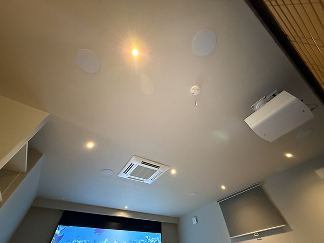 また、リア側はダイニングへの動線を考慮し、スピーカーは埋込型を採用。弊社オリジナル「Home Theater Factory HF-SP525IC」を使用し、トップ・サラウンド・サラウンドバックをすべて天井内にスマートに設置しています。