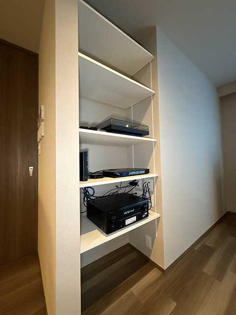 機材は、側面のデッドスペースを有効活用した収納スペース内に設置。生活空間に機器を露出させない、すっきりとしたレイアウトを実現しています。