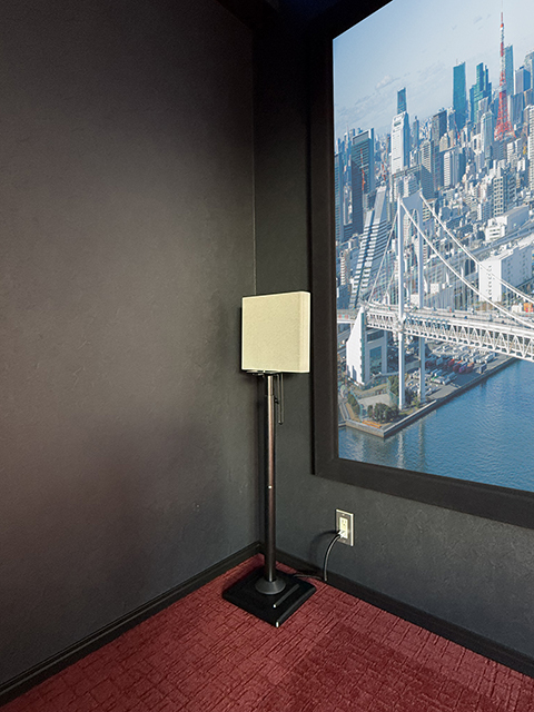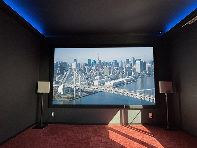フロントスピーカー2本は、当初スクリーン側面への壁掛けを予定しておりましたが、壁面に近すぎることで音の反射効果が十分に得られない可能性があったため、サードパーティー製のスピーカースタンドをご用意いただき設置しております。