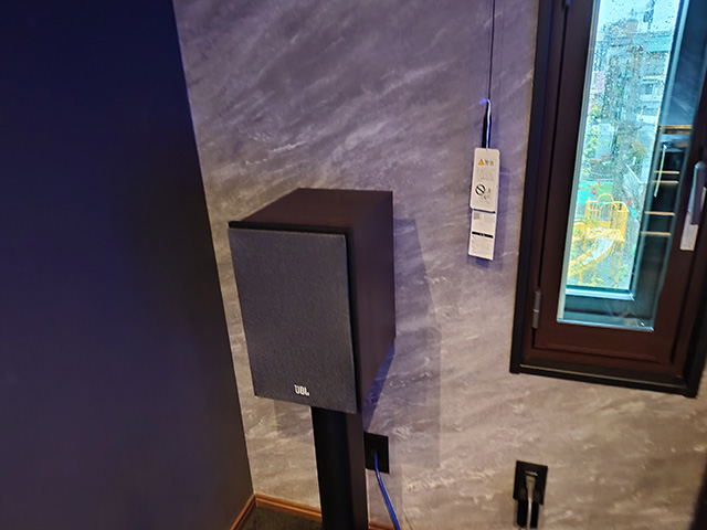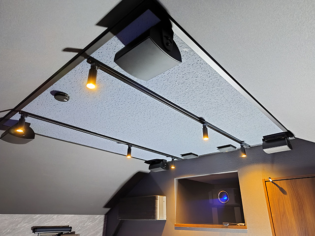 天井高が通常より低い場合は本来埋込タイプのスピーカーが理想でしたが、今回の施工例では屋根の構造を踏まえ、天吊タイプのスピーカーを導入致しました。