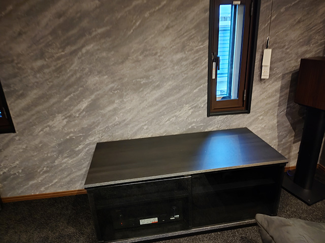 プロジェクターの設置位置の決定が一番難しかったのですが、画面サイズを可能な限り大きくするため、奥の部屋との兼ね合いを慎重にとりながら大胆に掘り込みをしました。映像が欠けないよう、掘り込みの高さも計算して調整しております。