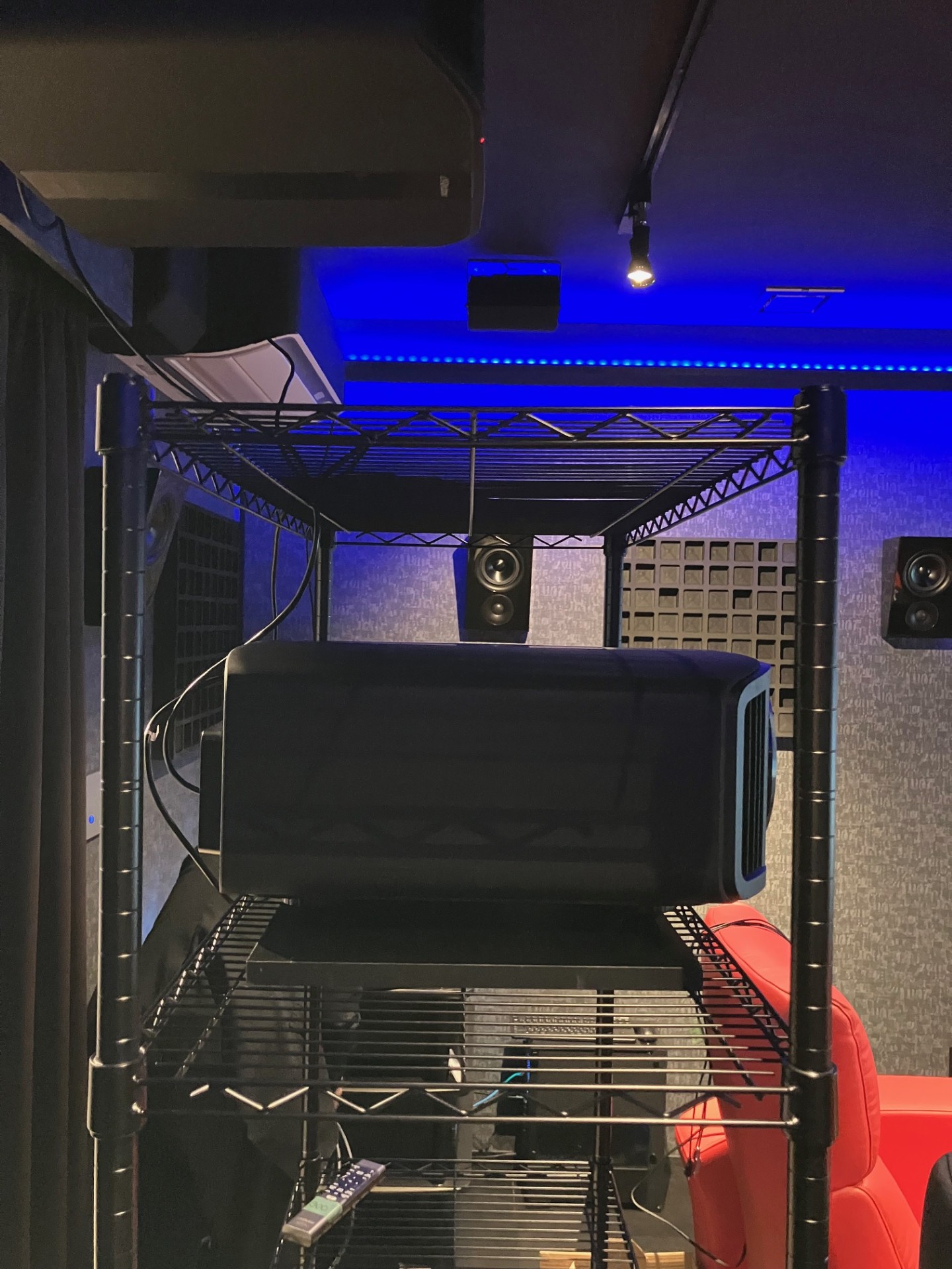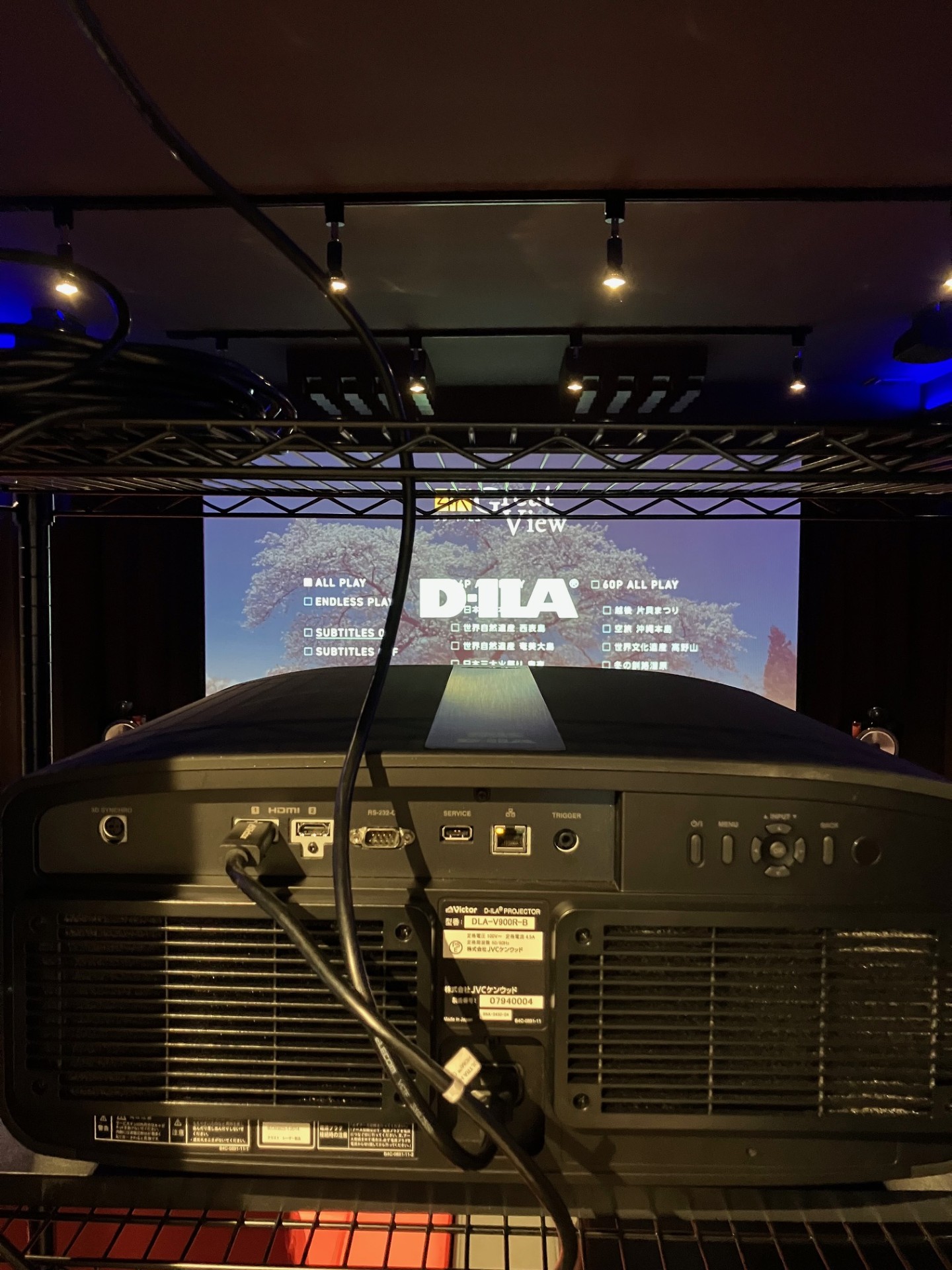以下は、明日の視聴会のための設営風景です。組み立てたラックの上にVictor DLA-V900Rが乗っています。その上に天吊りされているプロジェクターは常設してあるVictor DLA-V800Rでどちらも新しいファームウェアにバージョンアップしてあります。