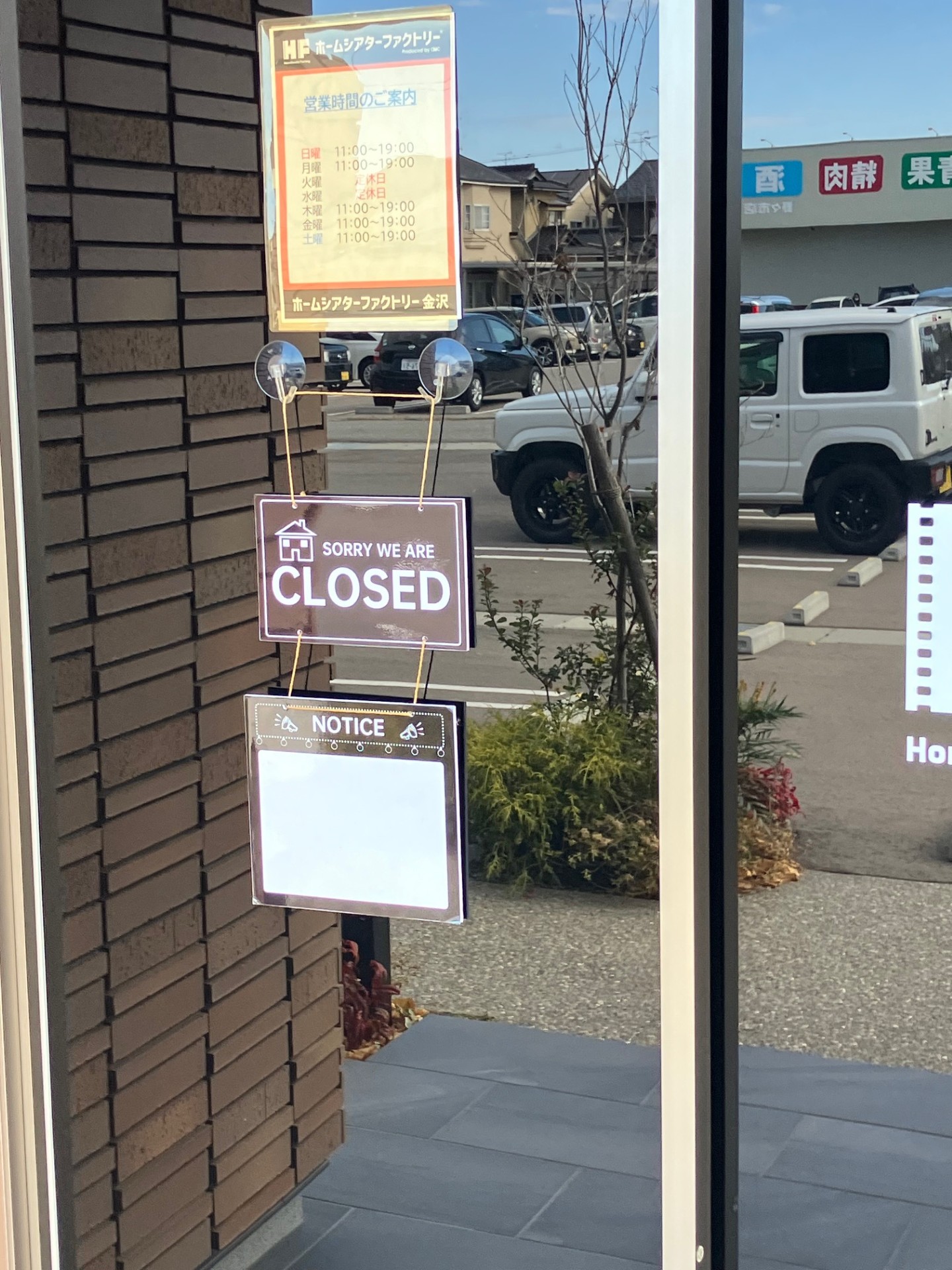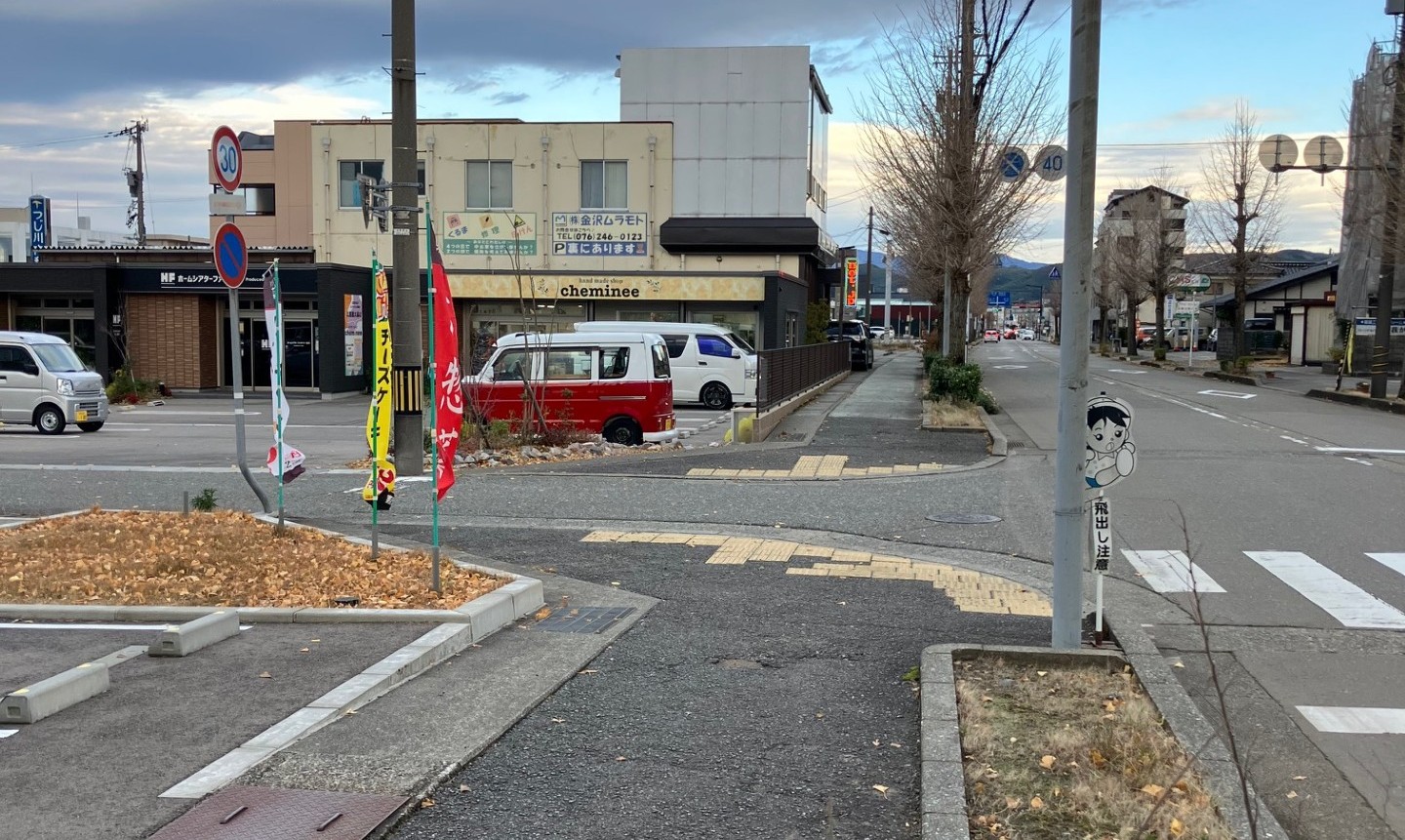 以下は、ホームシアターファクトリー金沢の店舗側から見た風景です。真正面に業務スーパーがあります。