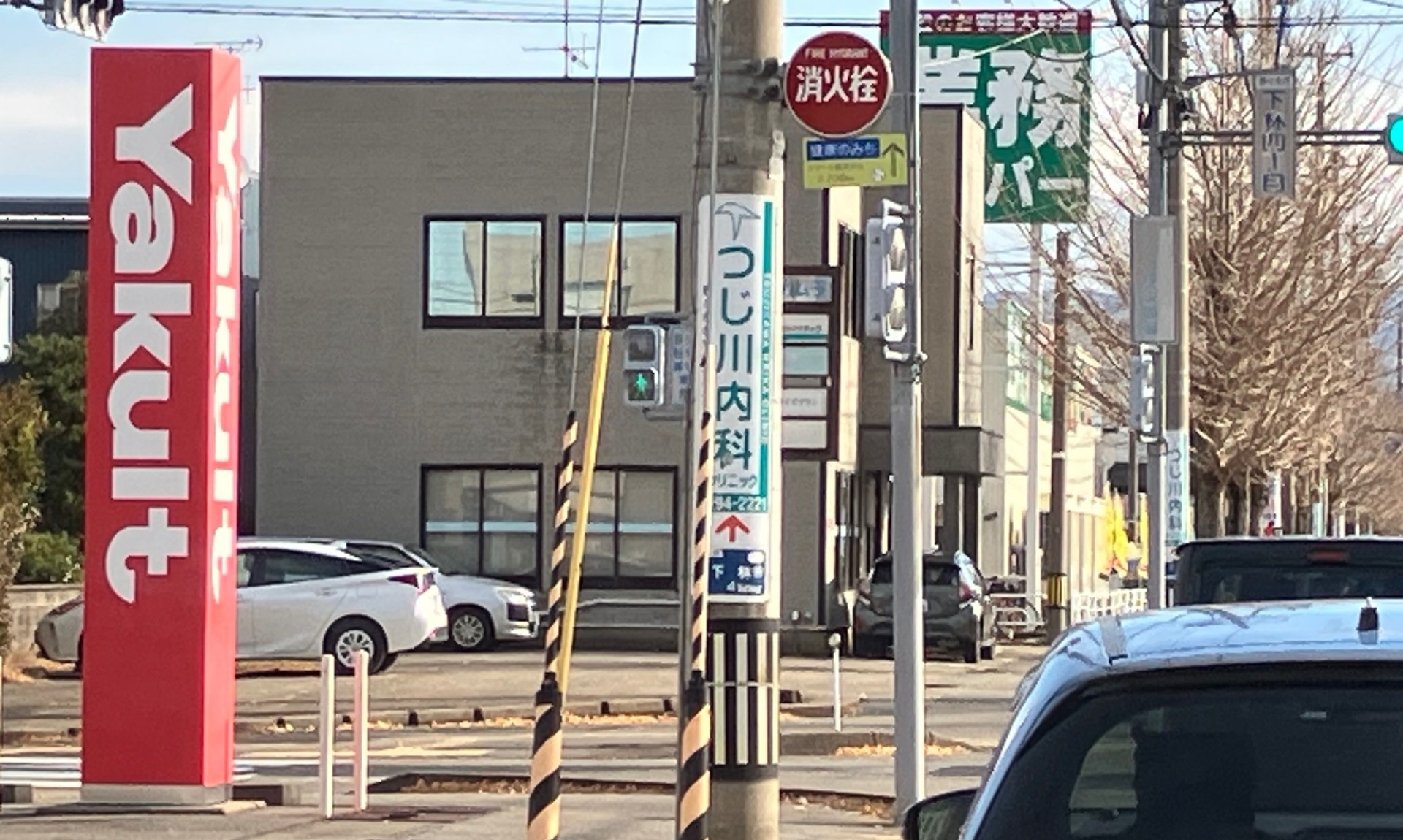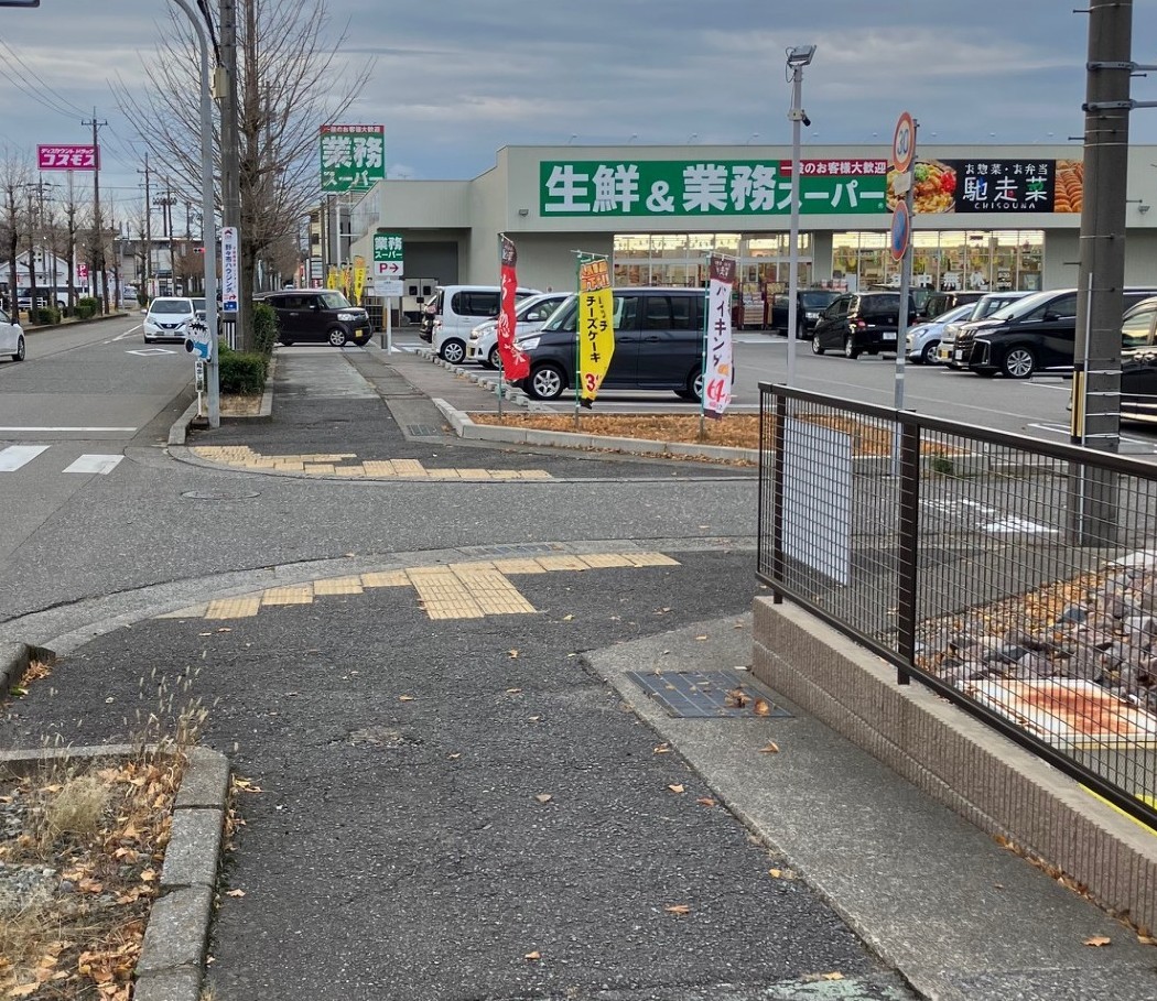 野々市中央公園、市民球場側(海側)から進むと下記の写真のように左上に緑の業務スーパーの看板が見えてきます。