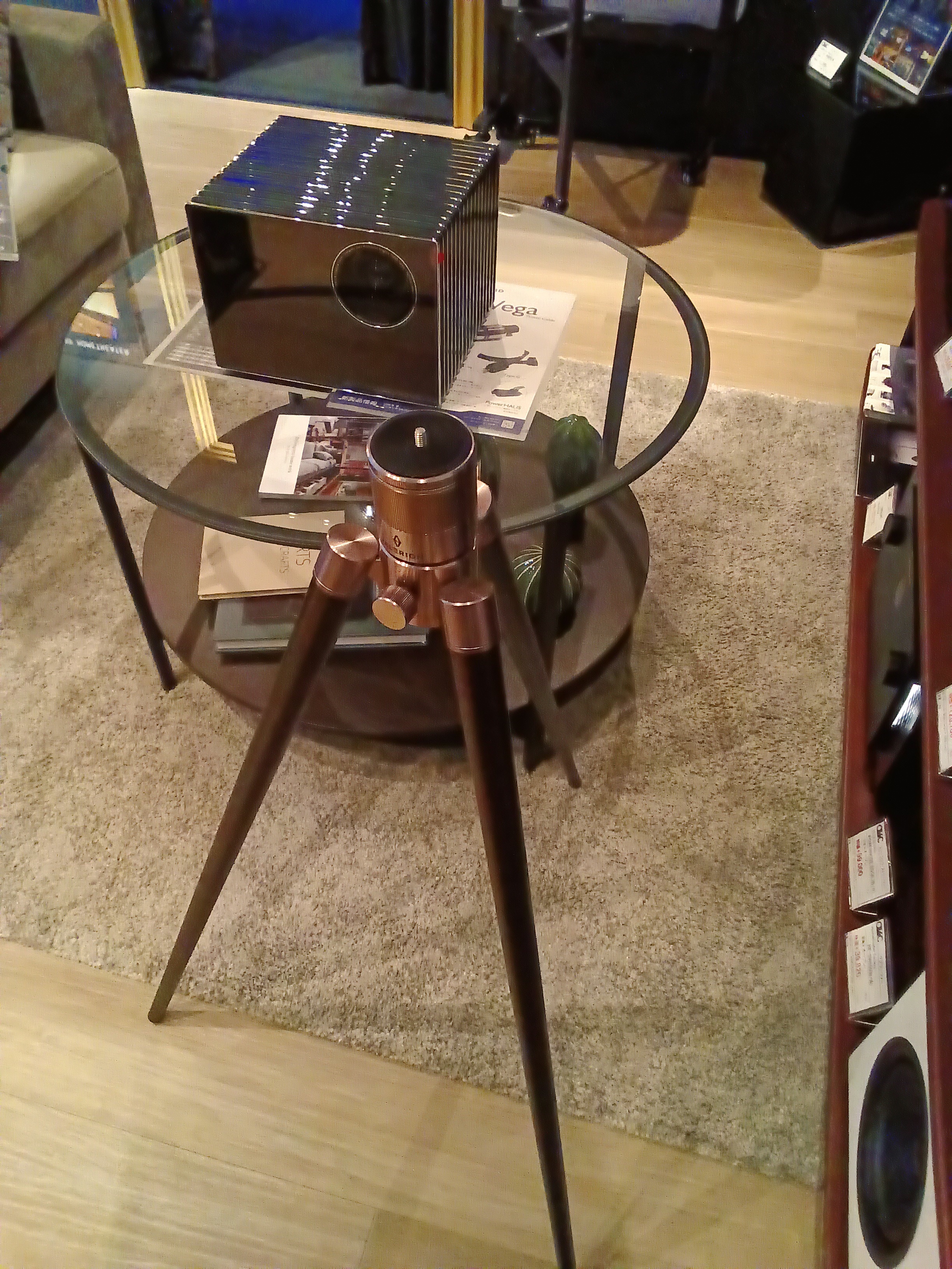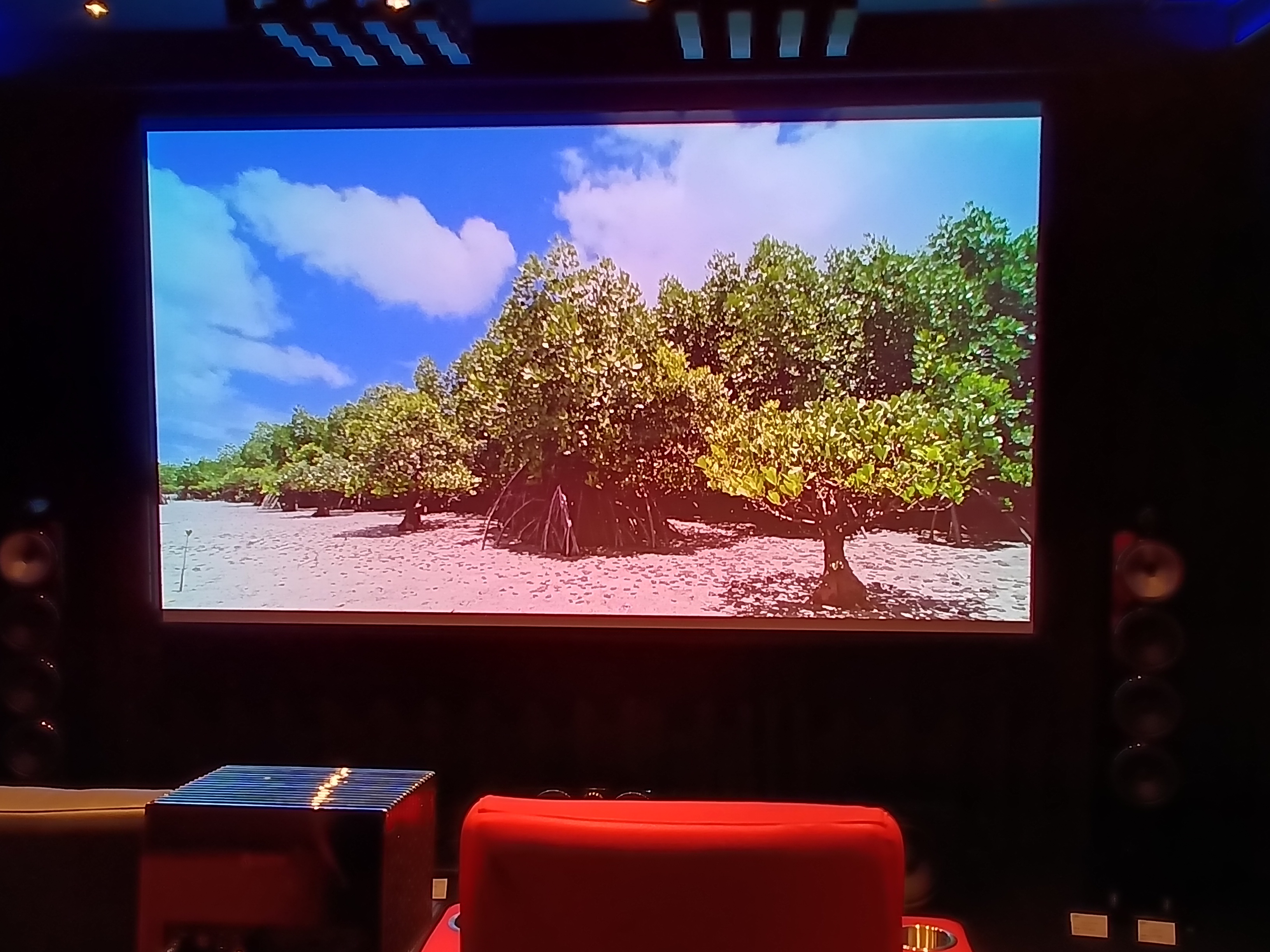 三脚を用いて専用室に設置してみました。120インチのスクリーンに約2.64mの距離で投射しています。