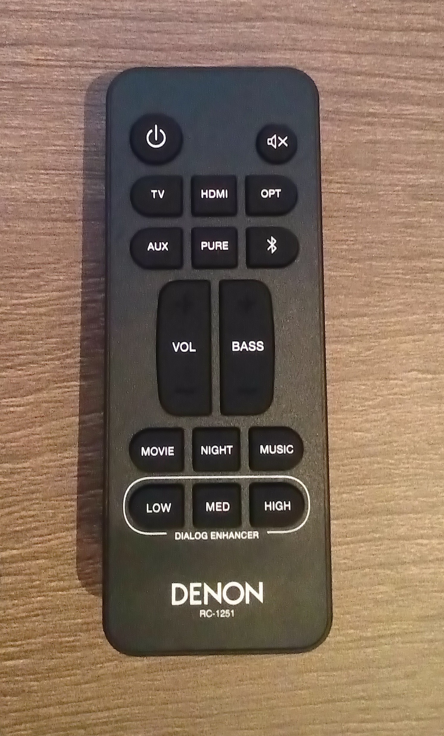 以下はリモコンで、音量やサブウーファーの音量の調整、映画のせりふや音楽のボーカルの音量を調節して聴きやすくする設定(DIALOG ENHANCER:3段階)も可能です。また、Bluetooth機器の音楽ファイルをワイヤレスで聞くこともできます。