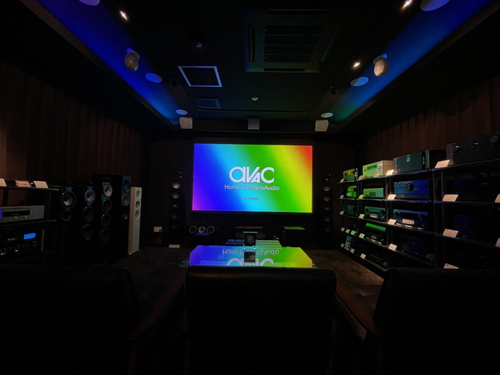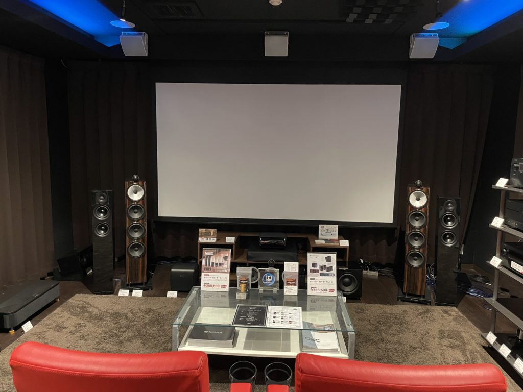 天井には21本のスピーカーを常設展示しており各種ドルビーアトモス構成Chベースによる
