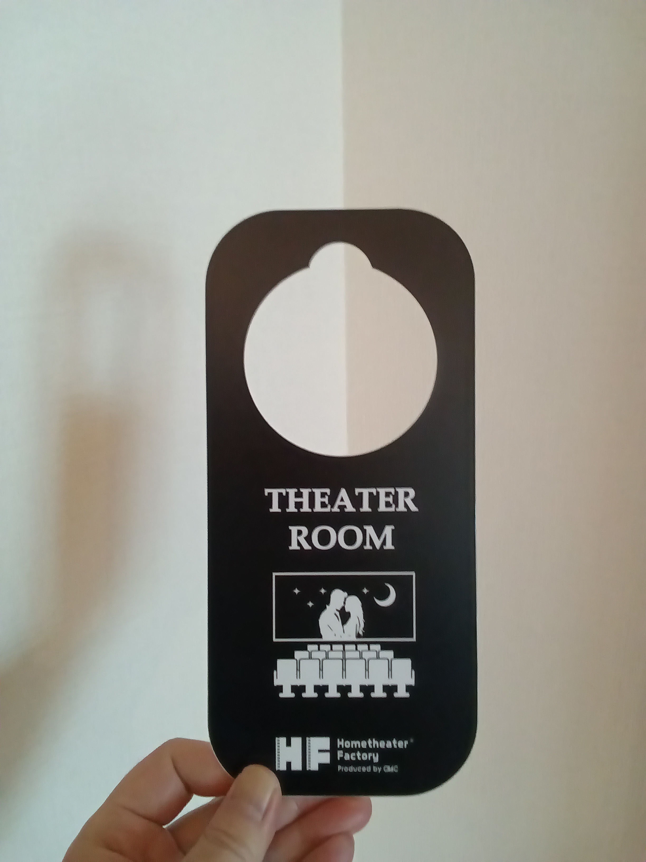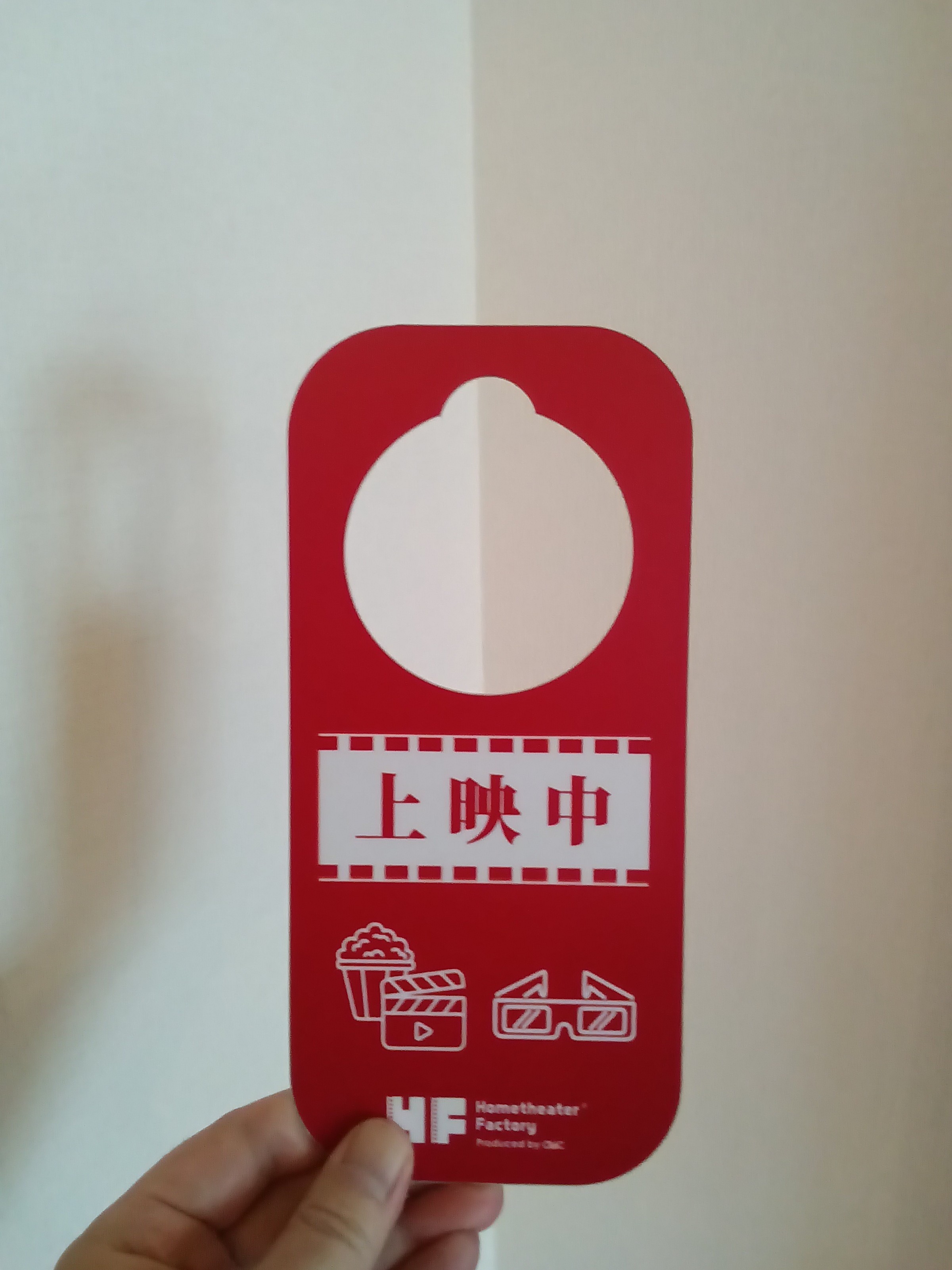 自室やリビングルームの手前にいかがでしょうか?サインプレートでございます。裏返すだけで「上映中」。お静かにお願いいたします。