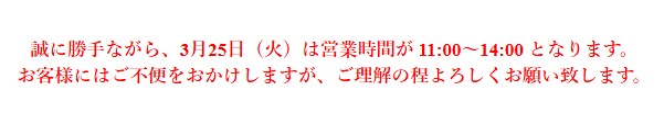 誠に勝手ながら、3月25日(火)は営業時間が 11:00~14:00 となります。