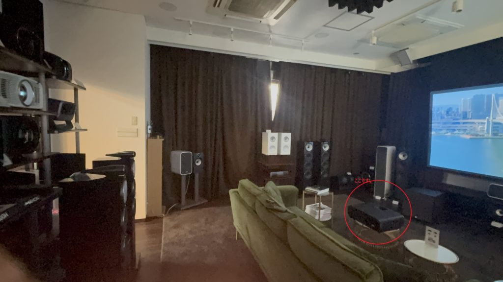 投射距離が短いんです。プロジェクターが置いてあるのは椅子の後ろではなく椅子の前。