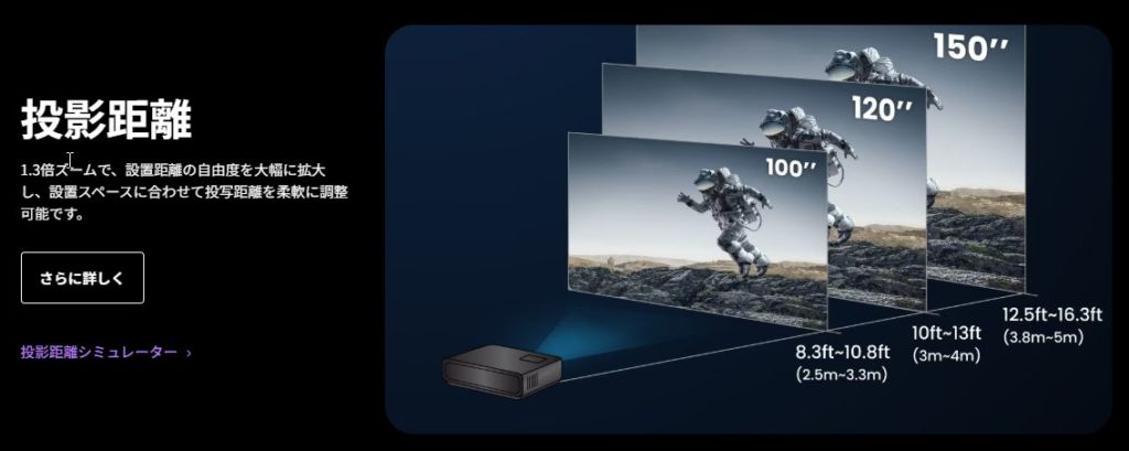 投射距離は100インチで2.5mから3.3m、120インチで3-4m、最大150インチまで行けます。