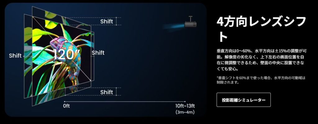 そして垂直60%、水平15%のレンズシフトは過去のDLP機種と同レベルかそれ以上の幅となります。