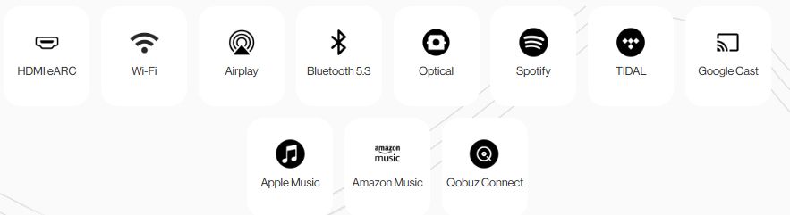 これでDollby Atmos、DTS:X、ソニーの360 Reality Audioの各フォーマットやHDMI eARC、Optical、Airplay,Google Cast、Bluetooth5.3など様々な接続、Apple Music(!)Amazon music、Spotify、Quobuz Connectにも対応します。
