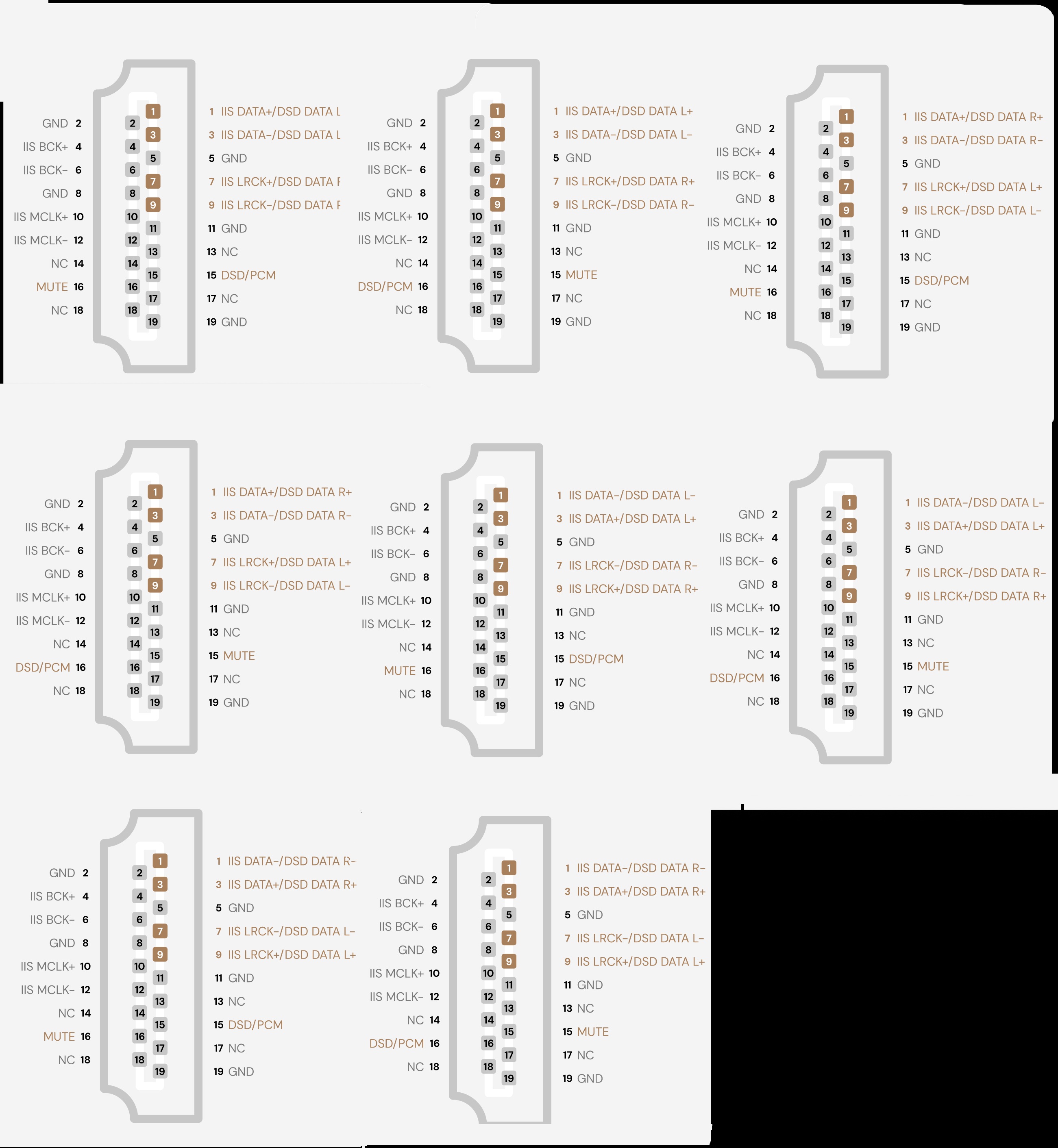 8つのIIS出力モードはそれぞれピンアサインが異なり、ご使用の機器のほとんどに問題なく適応可能かと思います。