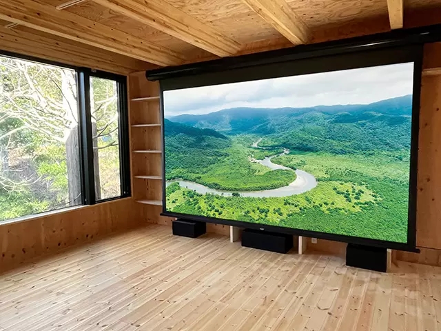 通常投射でハイエンドの機材を使う場合や小さなお部屋で超短焦点プロジェクターを使う場合、大型テレビを使う場合、所謂スマートプロジェクターで短めの投射距離を使う場合などケースバイケースでいろいろな方法をご提示可能です。