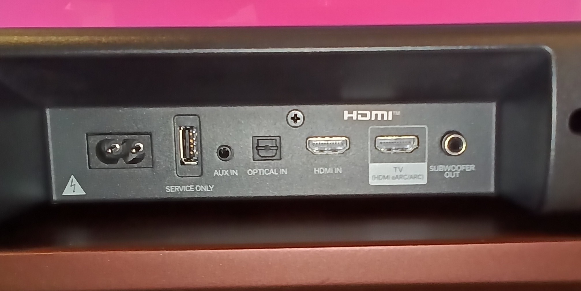 左側から電源(メガネ型)サービス用USB(メモリは挿せません)ステレオ入力のピンジャック、光デジタルの入力、HDMIの入力(これはBDレコーダーなど外部機器の入力用です)、HDMI OUT(eARC対応なのでテレビからの音を受けられます。HDMIコントロールであるCECやALLMにも対応しています)、一番右が外部サブウーファー用の出力端子です。
