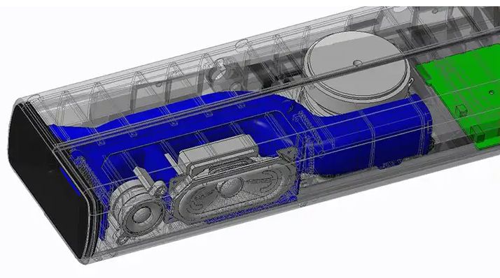 ツィーター・ミッドレンジの後方には長いロードホーンが連結されており、サウンドバーのサイドから低音を出力します。