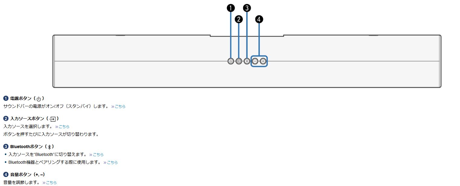 電源ボタンと入力ソース切り替え、Bluetoohのペアリングとボリュームの上下、これだけ。