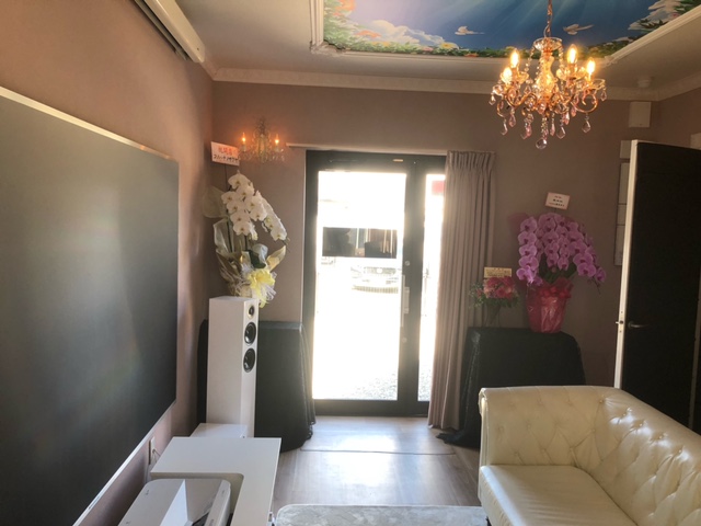 奥には当店自慢の「専用室シアター」コーナーが鎮座。